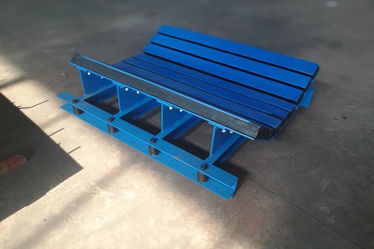 緩沖床的橡膠采用進口天然橡膠、橡膠彈性高、含膠量大、橡膠密實度高、抗拉強度大、能大程度上吸收下落物料的沖擊力,可有效的避免物料下落時對輸送帶的沖擊。緩沖床床體表面采用高耐磨分子材料,分子量大于650萬,光滑表面,摩擦系數(shù)小,耐磨性好,使得輸送帶運行時的摩擦力降到很低,廣泛用于礦山開采,礦井下巨型煤塊輸送。